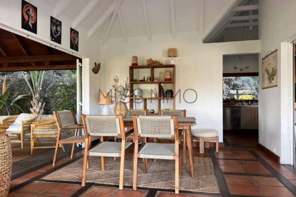 Its spacious living area, designed to take full advantage of the tropical climate, opens onto a large decked terrace, perfect for relaxing while gazing at the horizon. Under an elegant veranda, the outdoor living room invites you to relax in a gentle, breezy atmosphere. The villa also has two dining areas: an outdoor dining room under the balcony, ideal for al fresco meals with magnificent sea views, and an indoor dining room, offering a comfortable alternative during the hottest hours of the day.
